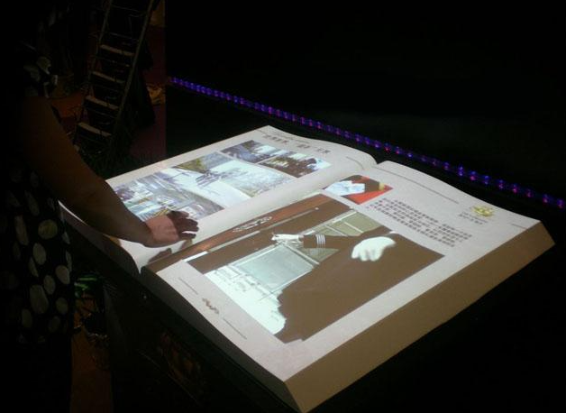 利用动作感应技术以及计算机多媒体技术实现的一种虚拟翻书的视觉效果,参观者只需站在电子书前方,在空中做出左右挥动手臂的动作,面前的电子书就会随着手臂的挥动进行前后的翻页。