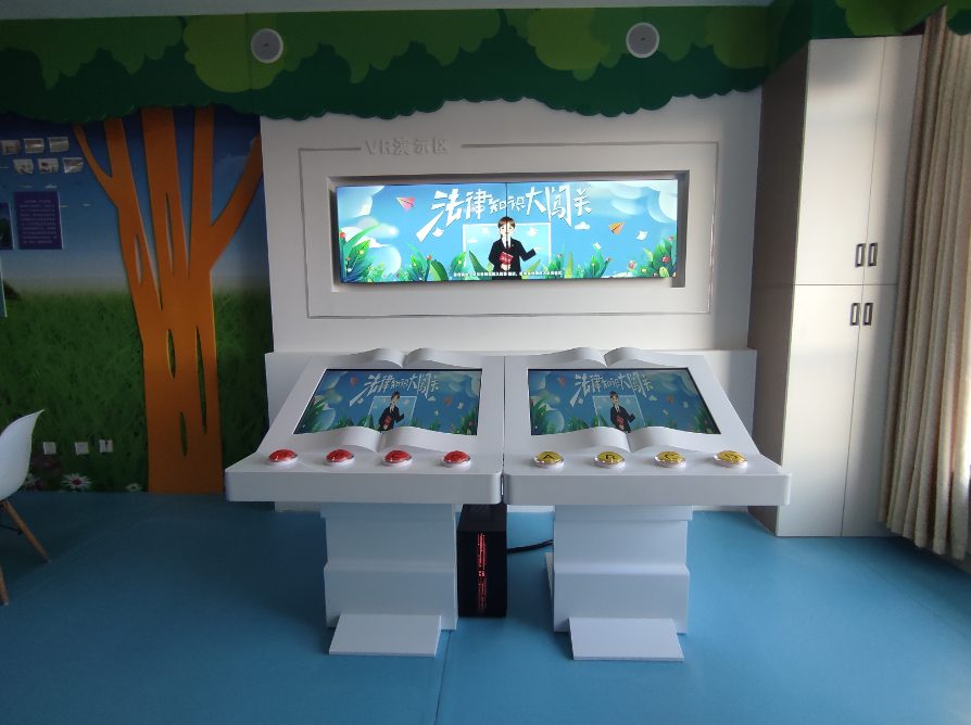 该系统以"竞技+学习"为核心,采用北京博诚盛源自主研发的交互技术,创新性定制2台落地式书籍造型触摸一体机,搭配高清液晶拼接屏,形成兼具美学设计与功能性的智慧普法终端。系统支持"整体屏联动展示"与"双屏分屏竞技"两种模式,通过法律知识抢答、互动问答等多元形式,将《未成年人保护法》《预防未成年人犯罪法》等法律法规转化为生动有趣的闯关挑战。